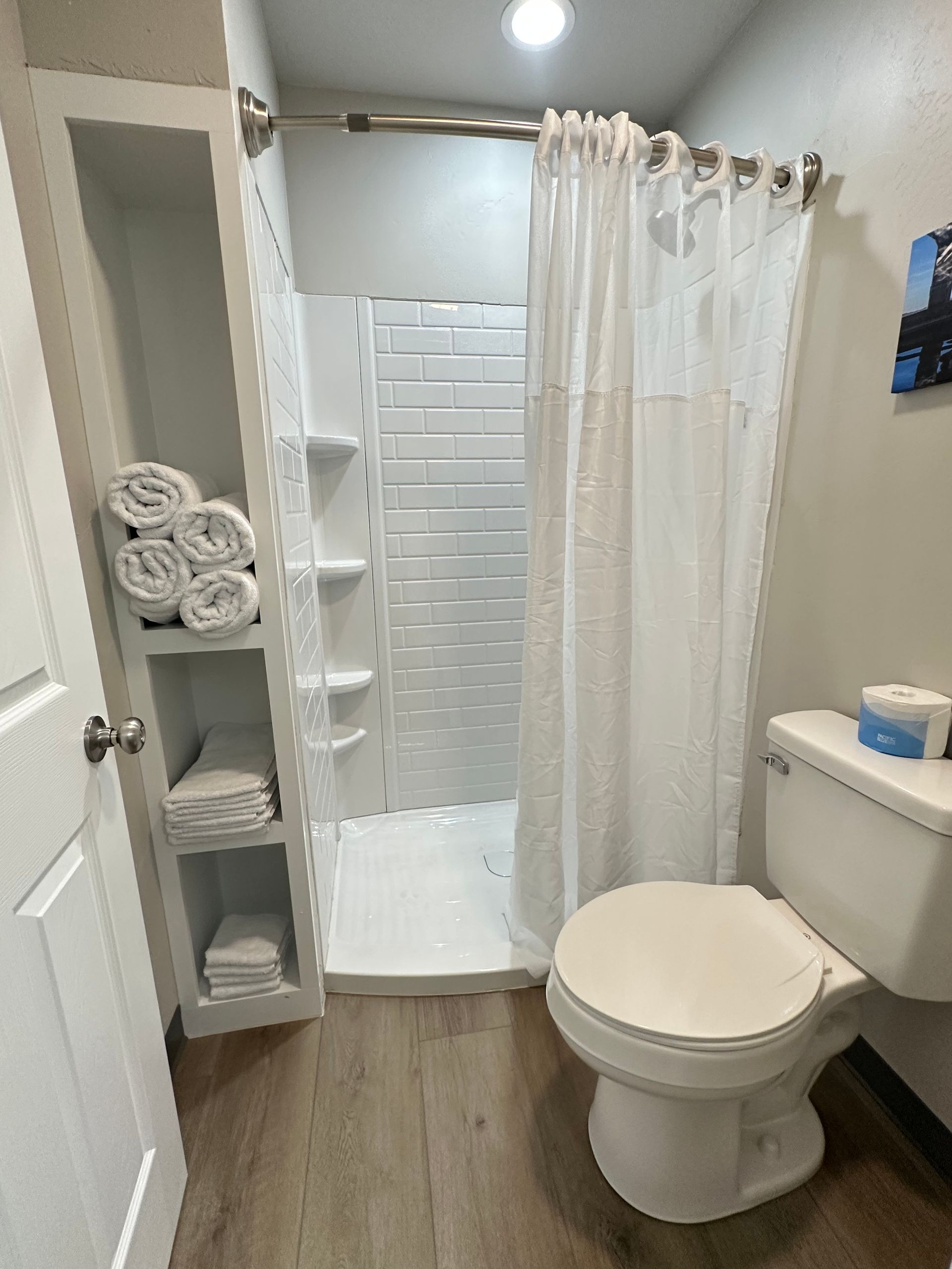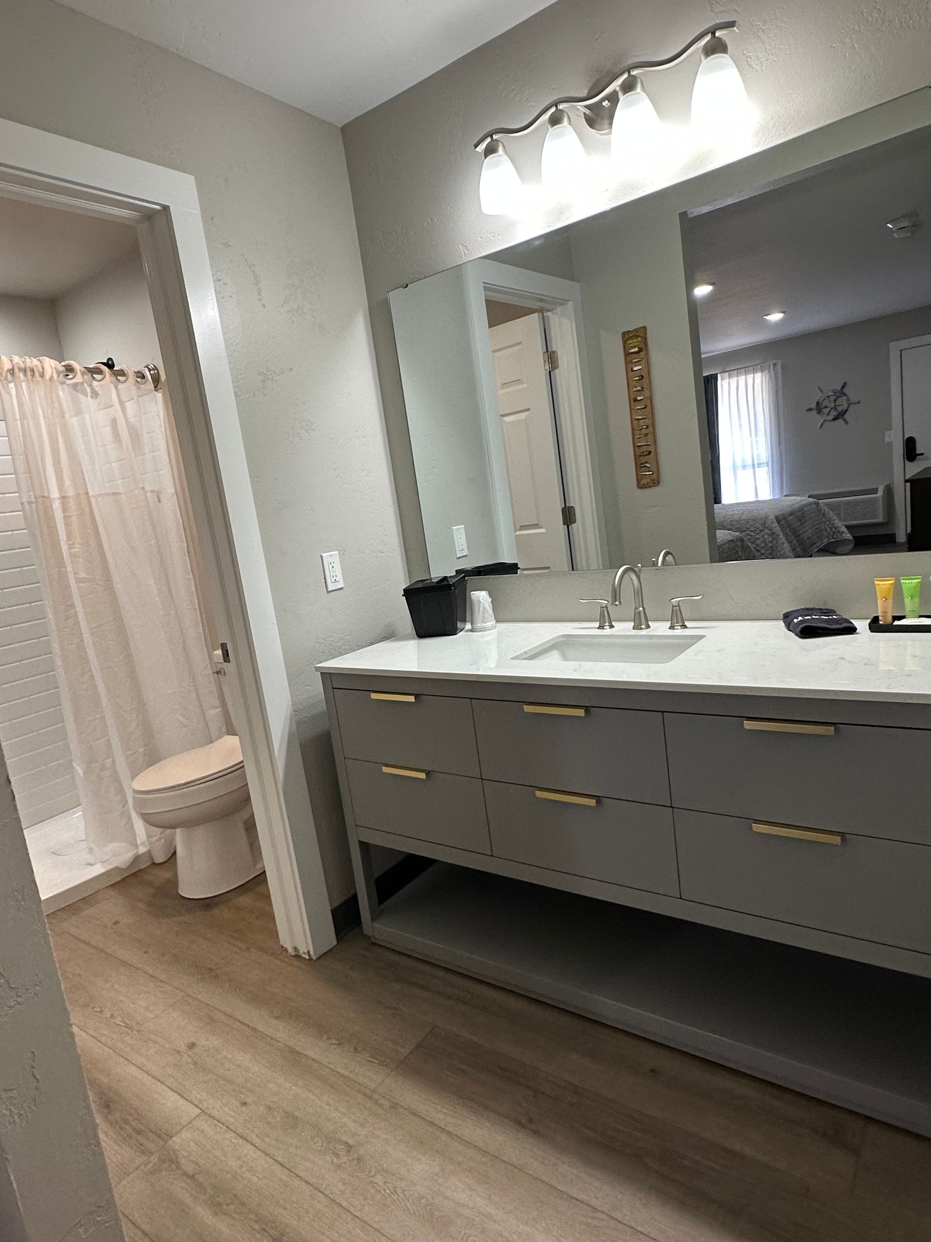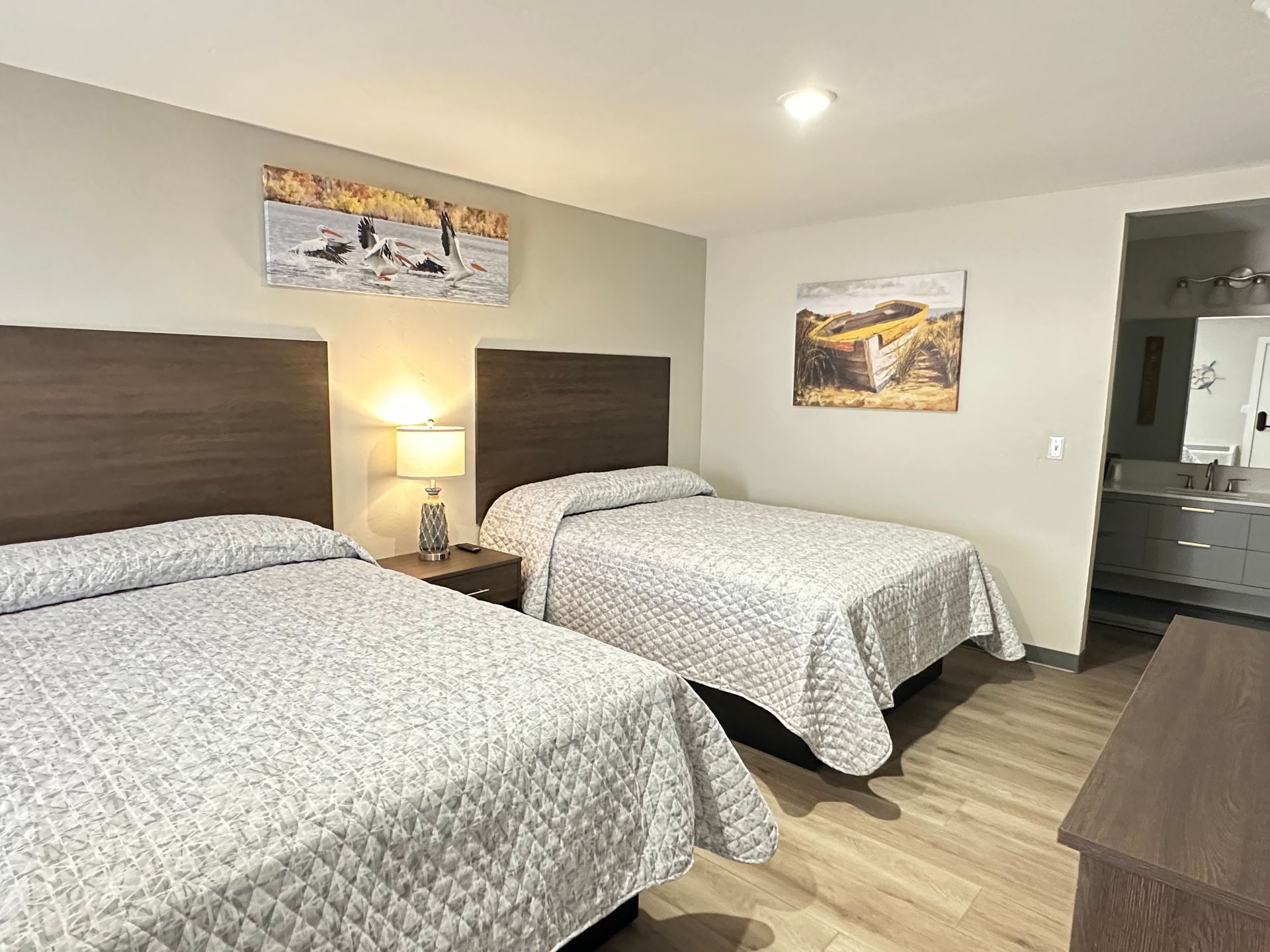 Perfect for families or small groups, the Double Queen offers spacious comfort in a warm and inviting setting. Two plush queen-size beds ensure a restful night’s sleep, while the nautical-inspired décor creates an immediate connection to the lake town atmosphere. The room includes a flat-screen TV, refrigerator, microwave, desk & a private bathroom with a walk-in shower.